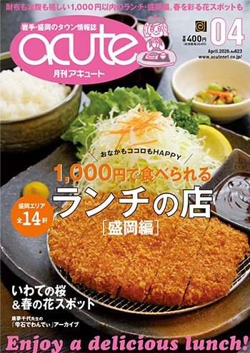 acute(アキュート)とは… 岩手県内+隣県から、街ネタ、エンターテイメント、グルメ情報など、毎日の暮らしを楽しく豊かにする情報を集めてお届けする総合タウン情報誌。